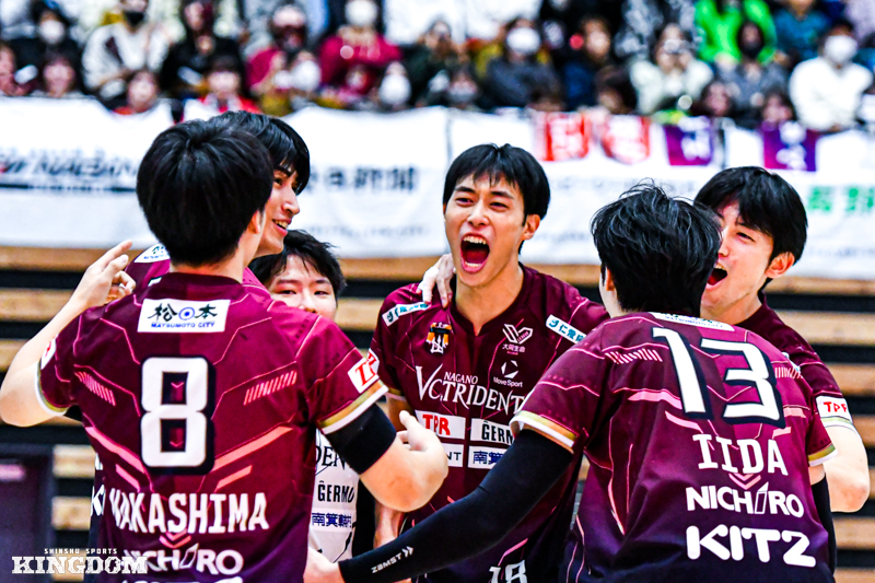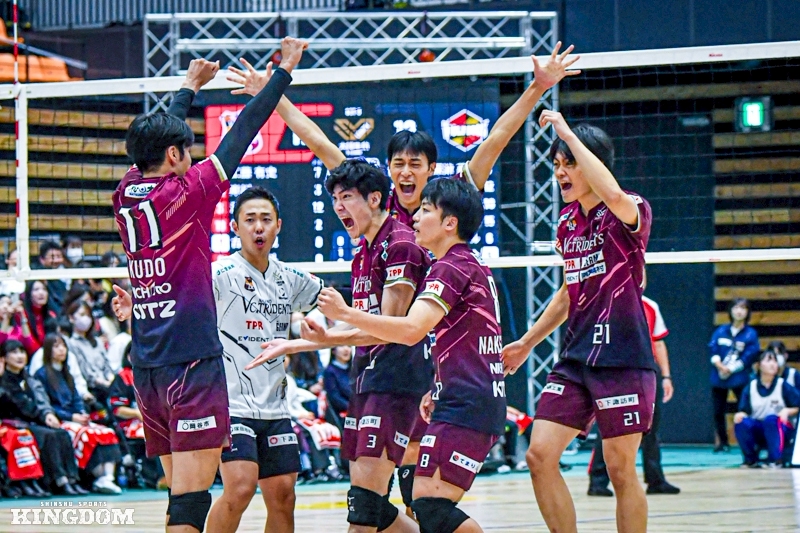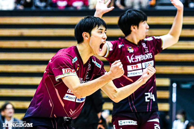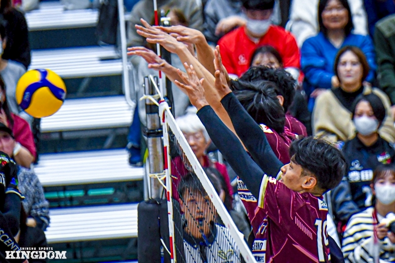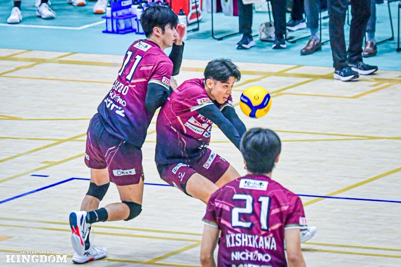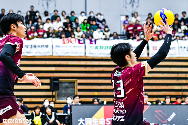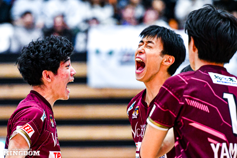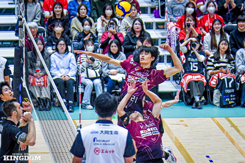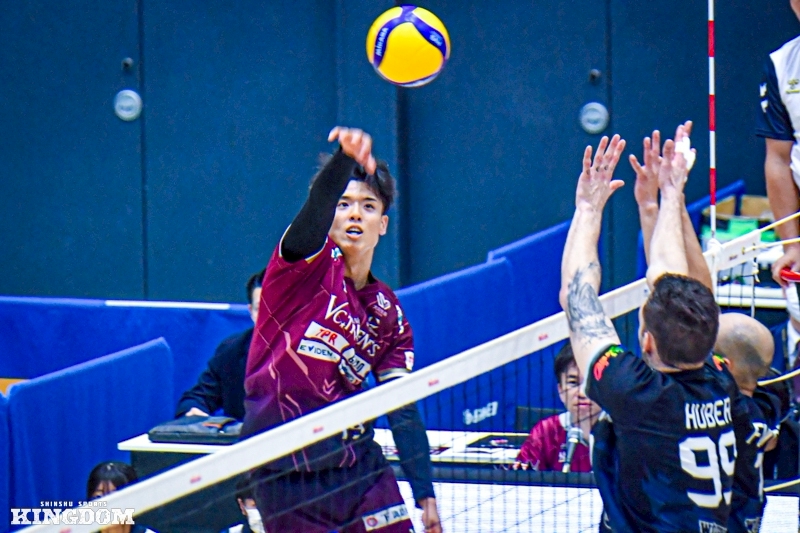 SVリーグ初出場となったオポジット(OP)酒井秀輔やアウトサイドヒッター(OH)工藤有史のスパイクで奮闘するものの、昨シーズン35勝9敗の成績を収めた強豪は隙を見せない。
