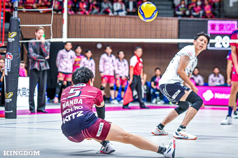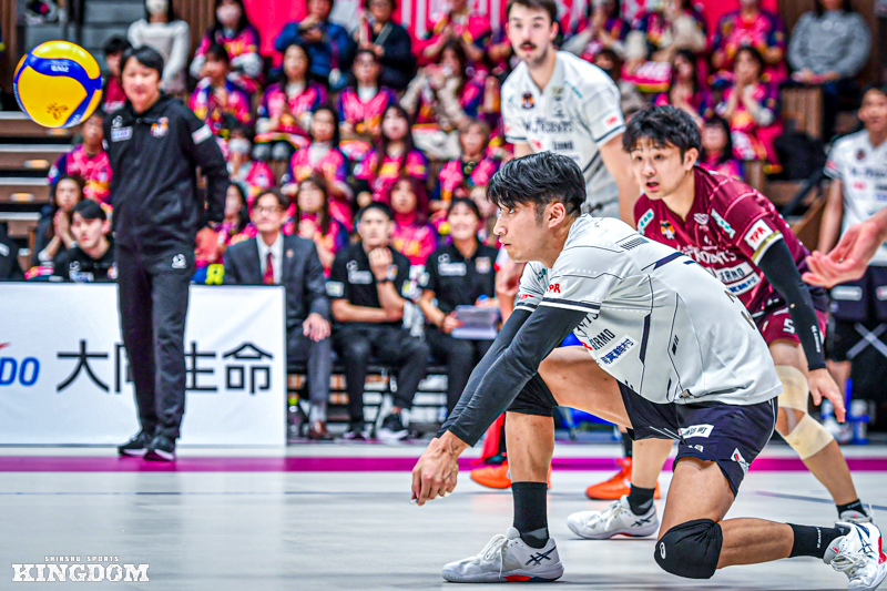 例えばGAME2の第3セット、23-24でマッチポイントを握られた局面。S中島のサーブで始まったプレーでは、相手OHヴィセンティンのアタックをOP飯田が1枚でブロックタッチを取る。跳ね上がったボールをL古藤宏規が懸命に繋ぎ、相手のミスを誘った。