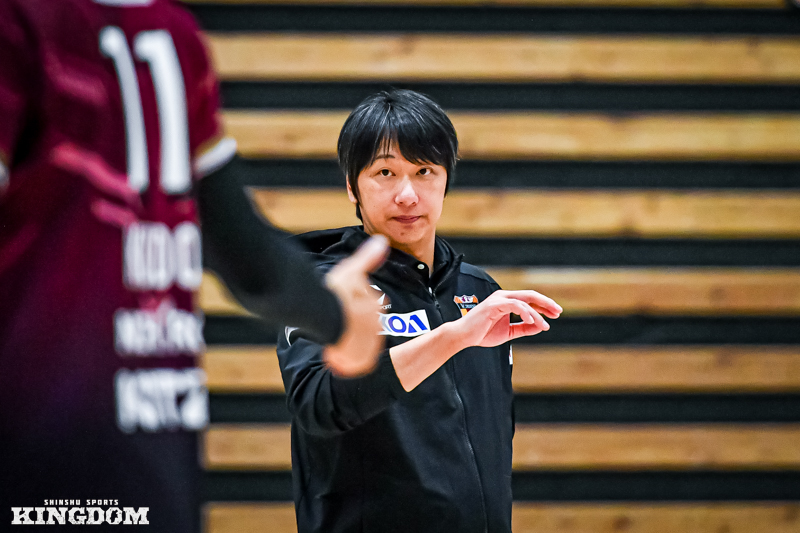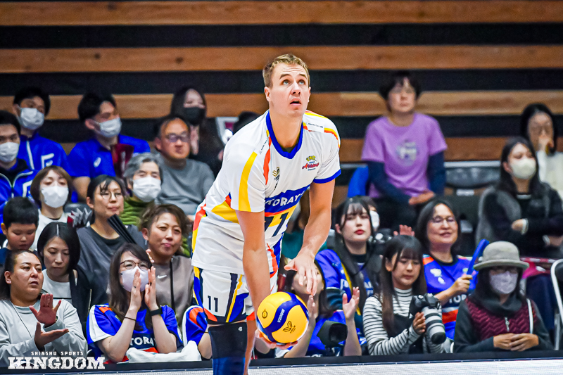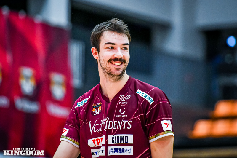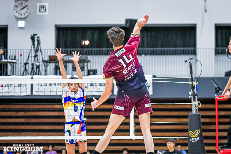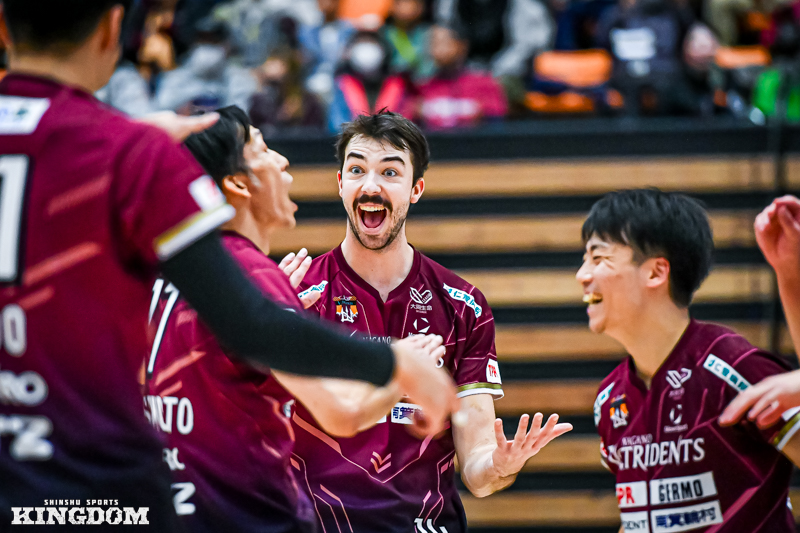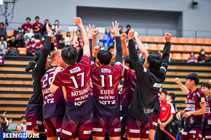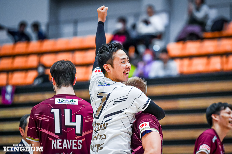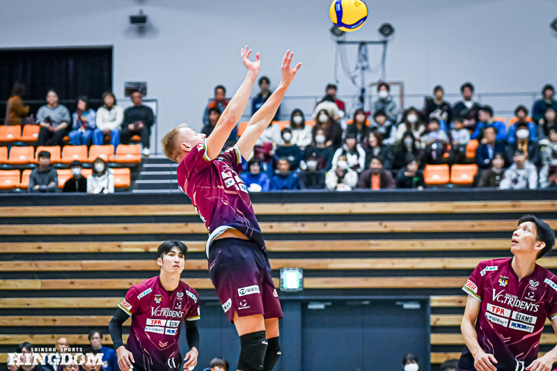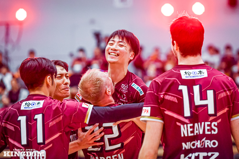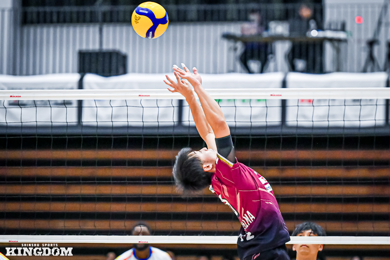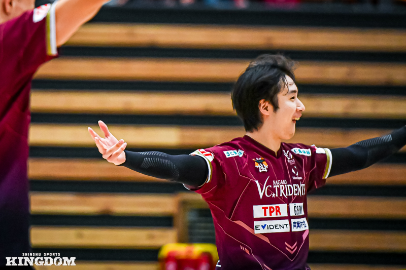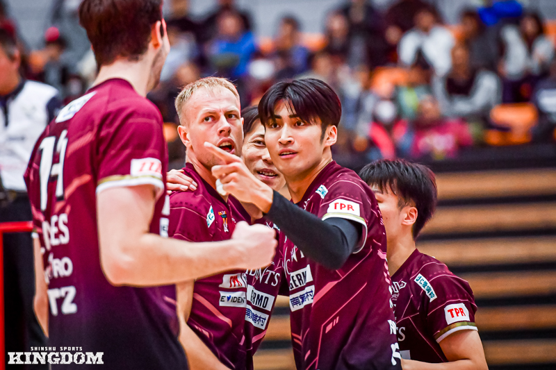 セッター(S)の中島健斗が「『今日は何としても勝つぞ』と、みんなが高い意識で第3セットに入れた」と振り返るように、序盤から丁寧にサイドアウトを取り、オポジット(OP)マシュー・ニーブスとミドルブロッカー(MB)山田航旗のサービスエースでリードを作る。
