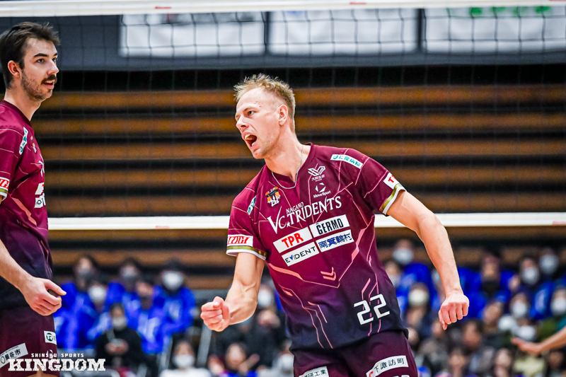 アウトサイドヒッター(OH)工藤有史が「なんとなく第3セットは取られてしまう記憶はあったが、コートの中では『守りに入ることなく、攻め続けよう』と言い続けて、それを実行できた」と話すように、23-24から綺麗なAパスが返るとニーブスがしっかりと決め切ってデュースに持ち込む。