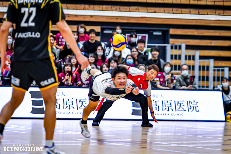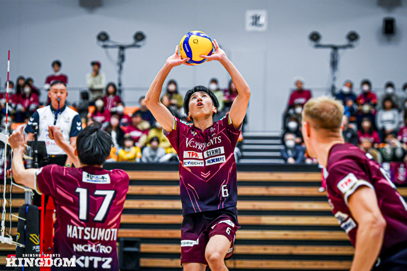 リベロ(L)古藤宏規がS中島健斗に丁寧に返すが、OH工藤有史のパイプ攻撃は相手ブロックに阻まれる。
