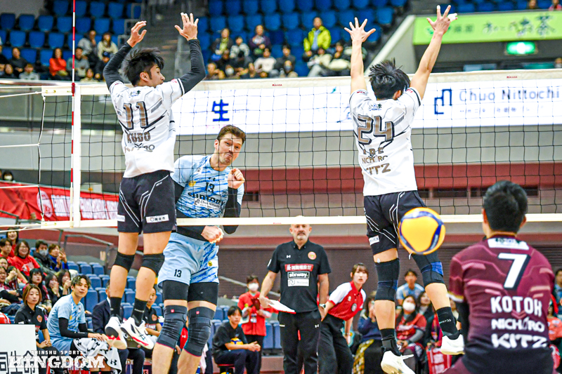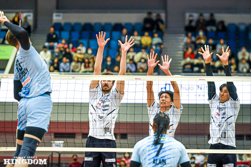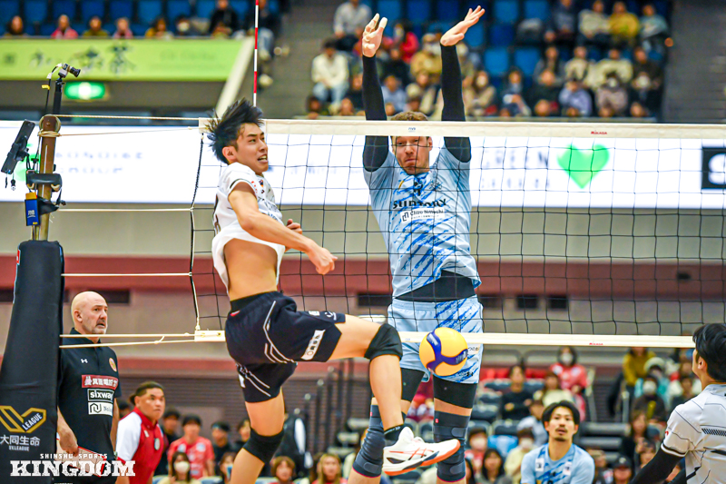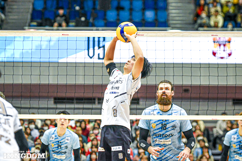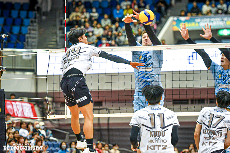 セッター(S)中島健斗も「相手チームはブロックのプレッシャーがすごいのは元々わかっていたので、思い切って真ん中を通したり、ムセルスキー選手の前からもどんどん攻めていったりすることを意識はしていた」と話すように、攻めの姿勢を崩さなかった。