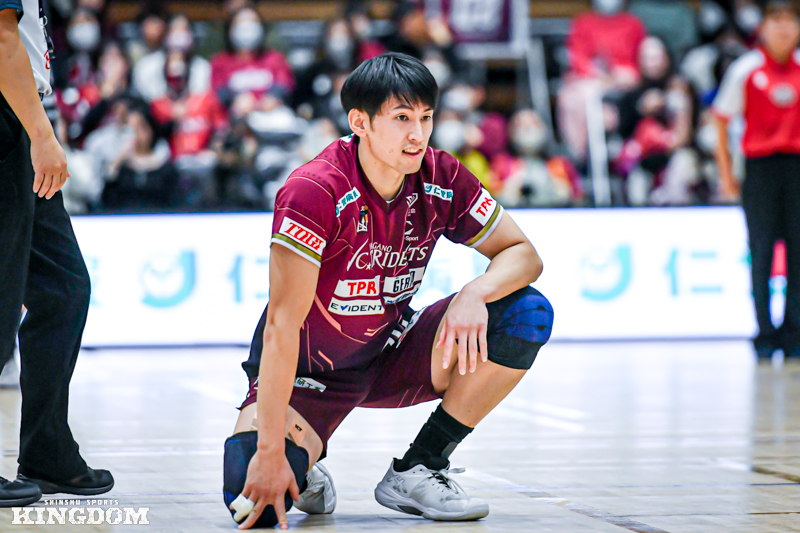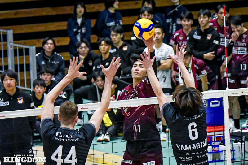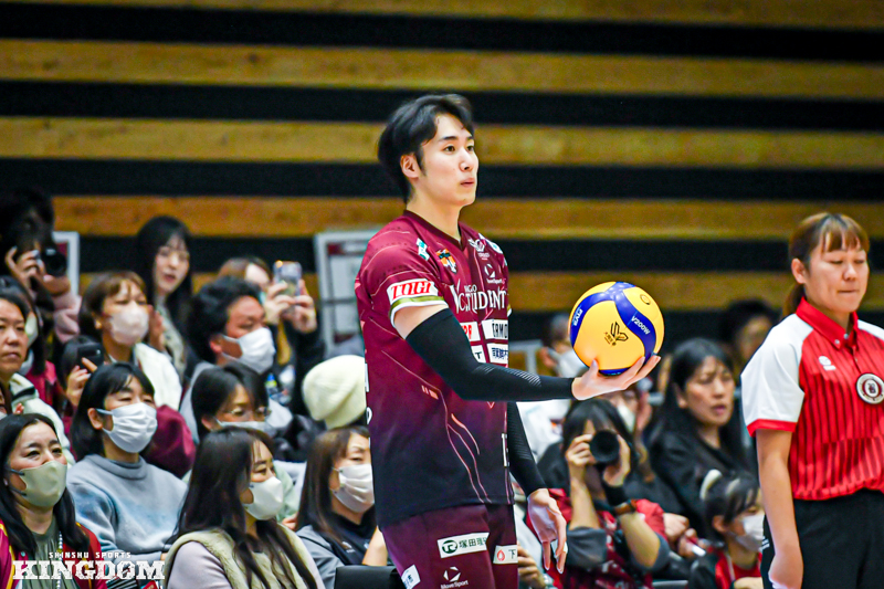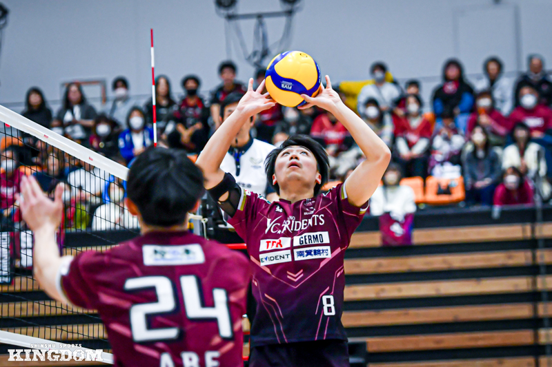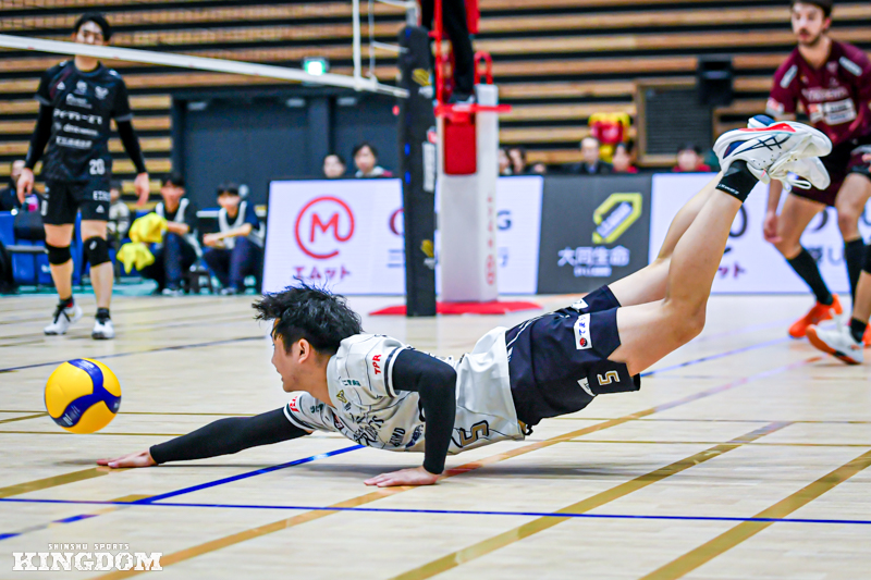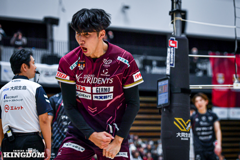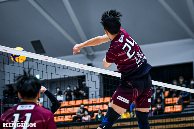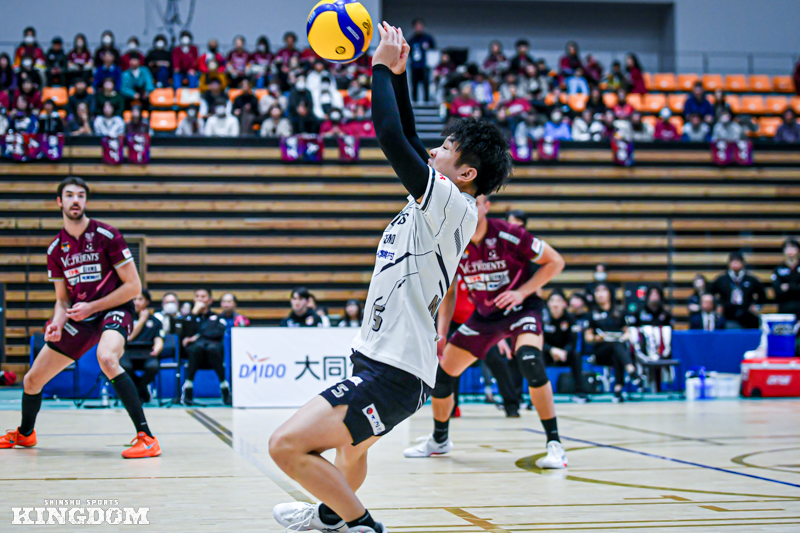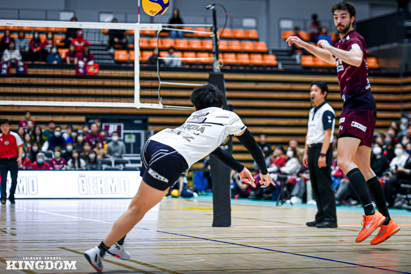 第2セット3-5の場面では相手のサーブに大きく乱されたが、セッター(S)中島健斗が観客席ギリギリまで走り込んでアンダーで上げたトスをバックアタックで見事に決め切った。