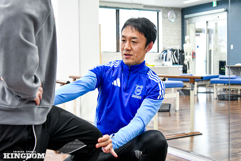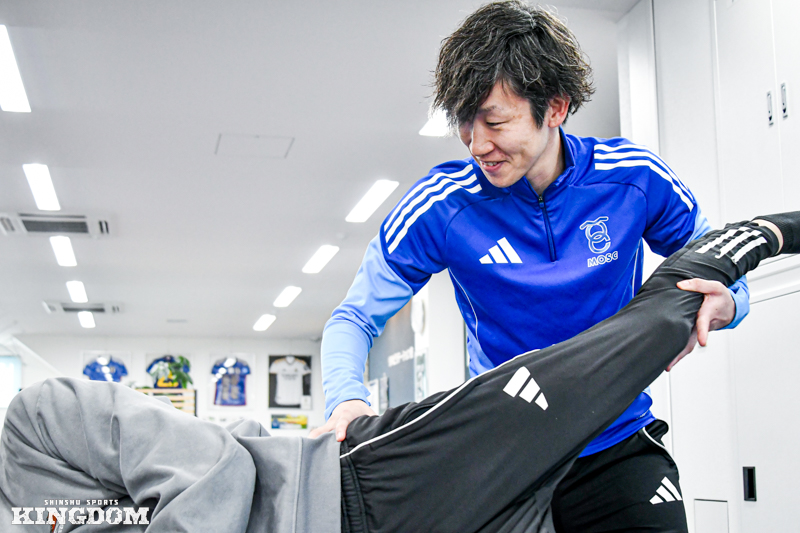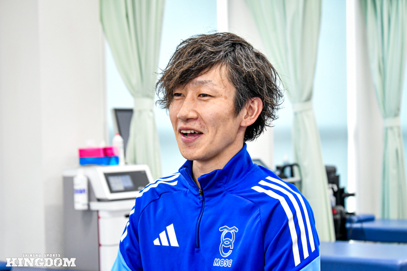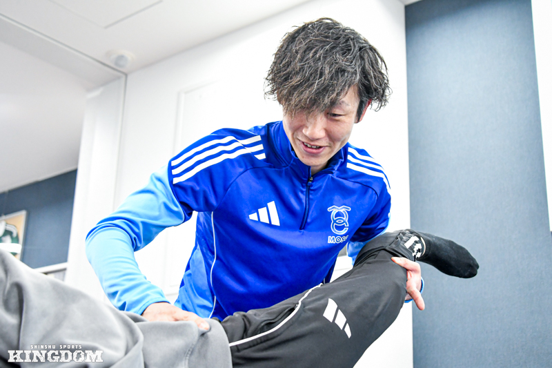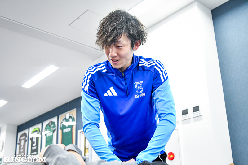 2025年シーズンまでJ3松本山雅FCでプレーした馬渡和彰選手のリハビリを担当した経験が大きな財産になった。2024年シーズンの終盤に両膝を手術。J1浦和レッズなどで活躍したトップアスリートに対して、自身を含む3人のスタッフでリハビリに当たり、馬渡選手とも話し合いを重ねながら復帰までのプロセスを丁寧に描いた。