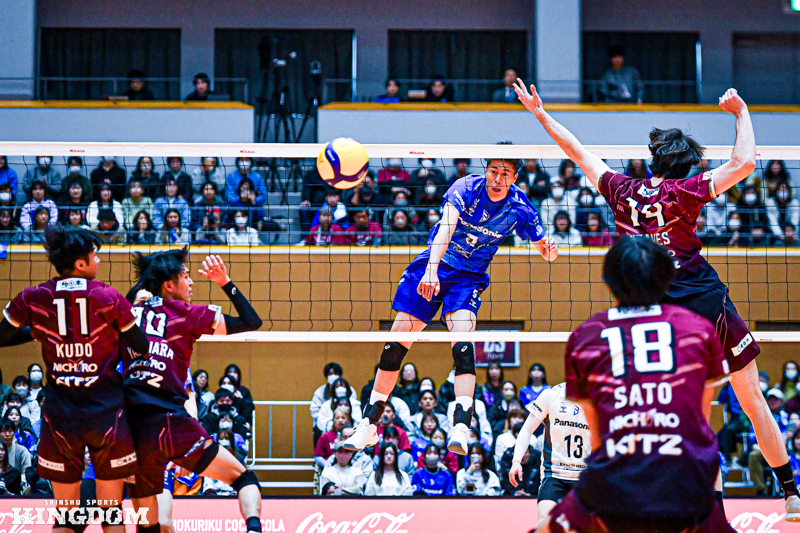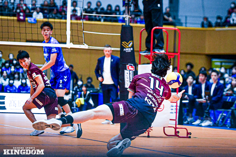 続く11-15の局面も、目を見張るパフォーマンスだった。千葉のサーブで崩し、相手オポジット(OP)西田有志のバックアタックを2枚でブロックタッチを取る。OP岸川蓮樹が拾うと、中島がアンダーでコート中央へ上げると再び佐藤がバックアタック。今度は2枚ブロックの間を抜いて決め切った。