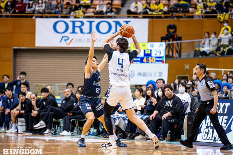 前半は36-43で折り返したものの、第3クォーター(Q)から流れが福井に大きく傾く。福井のベテランシューター田渡修人が2本連続で3ポイントシュートを沈めると、ライアン・ケリーにも3ポイントシュートを決められた。