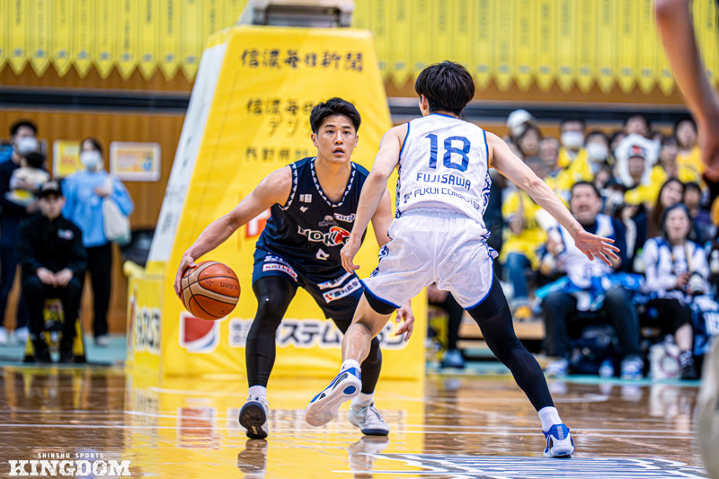 3月29日のGAME2。信州は前日のGAME1同様に、小栗瑛哉、JJ・オブライエン、栗原ルイスが欠場しただけでなく、GAME1で負傷した渡邉飛勇もベンチを外れた。ビッグラインナップを擁する福井に対して、スモールラインナップで臨まざるを得ない布陣ではあった。