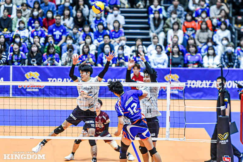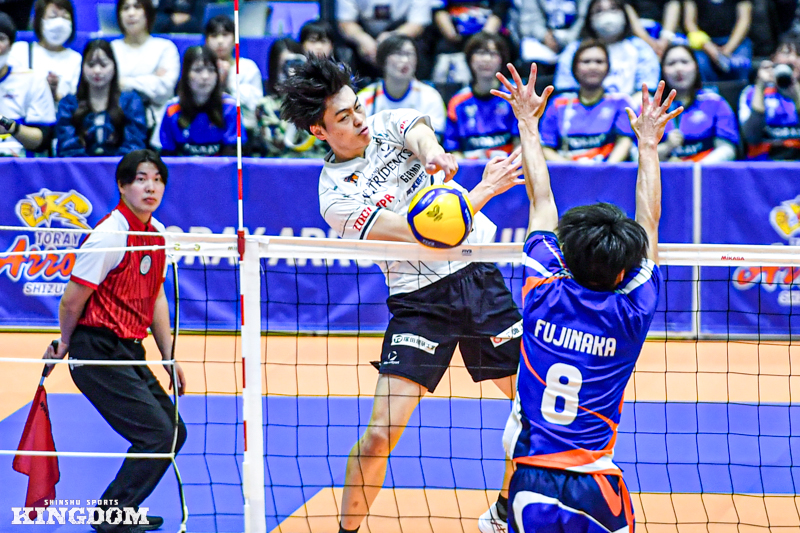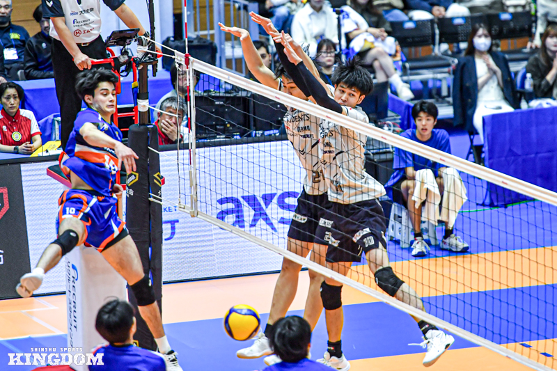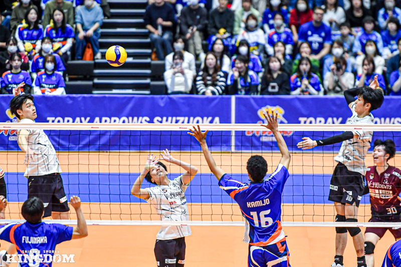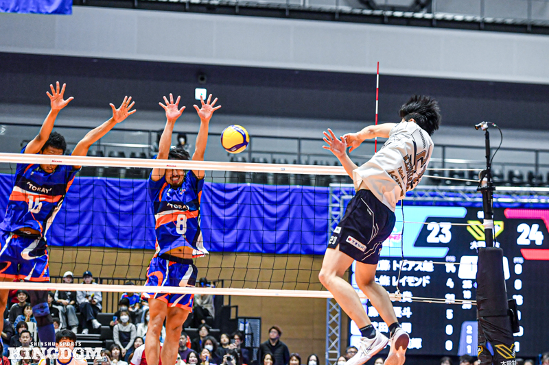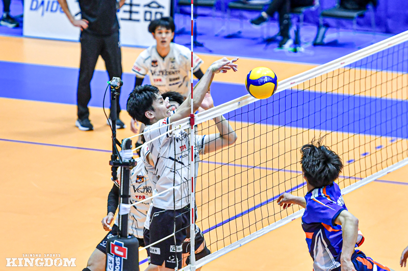 ファーストプレー。アウトサイドヒッター(OH)工藤有史のサーブで崩すと、オポジット(OP)岸川蓮樹とミドルブロッカー(MB)安部翔大の2枚ブロックでシャットアウトする。