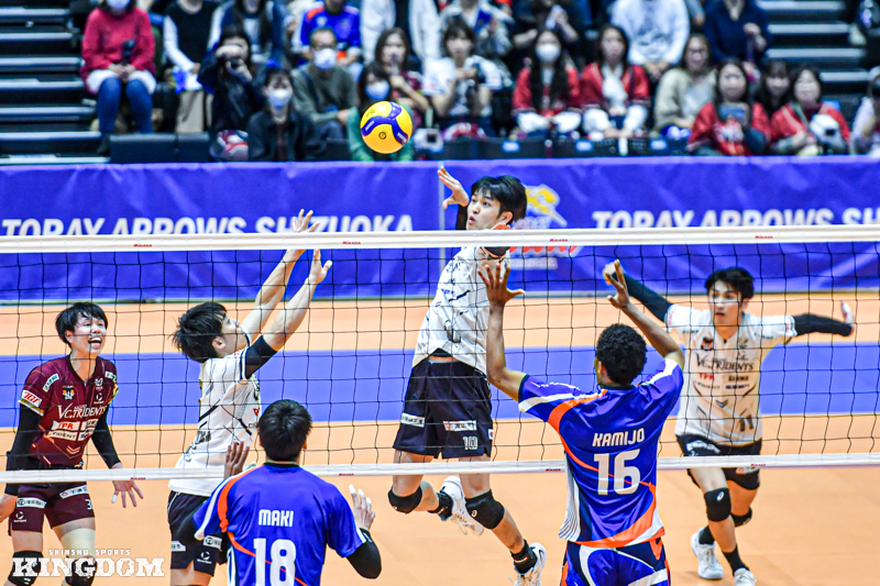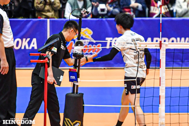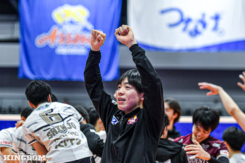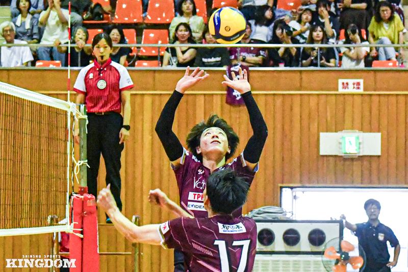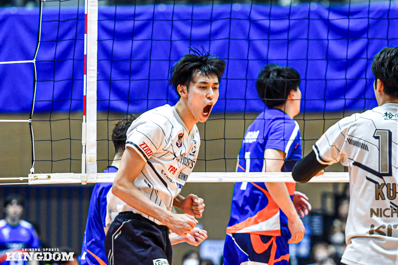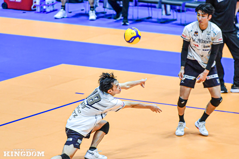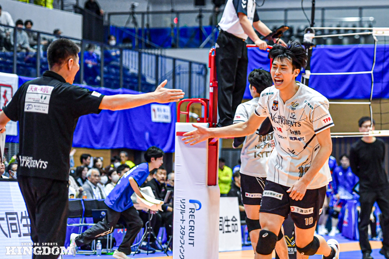 「最初は(サーブが)決まったと思っていて、気付いたらレシーブが上がっていた」と星名。無意識にボールの下に潜ると、バックコートの深い位置から美しい放物線を描いたトスをライトへ上げた。このボールを、十分な助走をつけたオポジット(OP)岸川蓮樹が相手コートに叩きつけた。